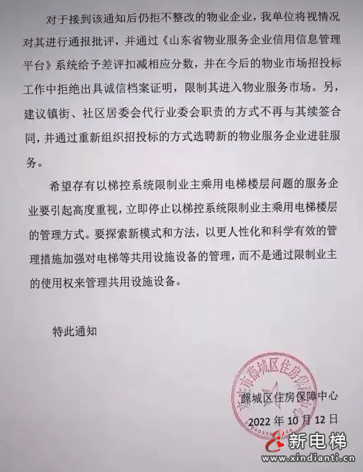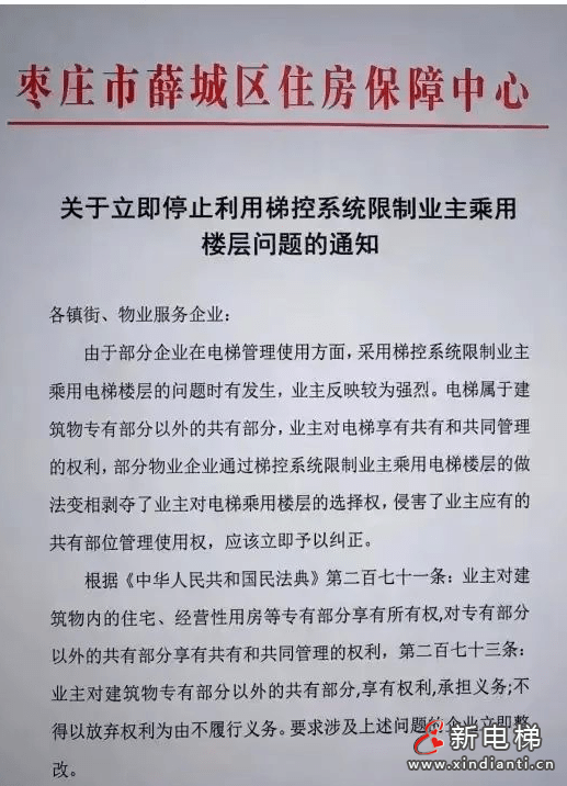 希望存有以梯控系统限制业主乘用电梯楼层问题的服务企业要引起高度重视,立即停止以梯控系统限制业主乘用电梯楼层的管理方式。